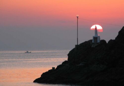 2019年02月02日 崎津集落近くの防波堤から望む夕日を受けて立つマリア像=1月29日午後5時40分、熊本県天草市河浦町 世界文化遺産の「長崎と天草地方の潜伏キリシタン関連遺産」の一つ、熊本県天草市・崎津集落に近い岬で、海に沈む夕日の中にマリア像…