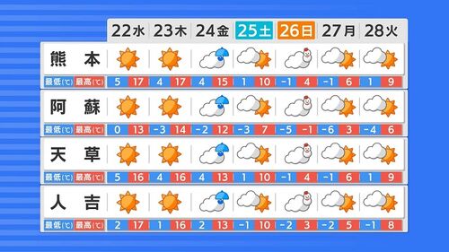 12月21日 RKK空色日記(熊本放送)週間予報を見ると…一番気になるのが日曜日の雪⛄気温も先週末より低い!極寒となりそう。寒波の前に…あす水曜・木曜の晴れを有効に!あすは、すっきりと晴れて洗濯日和に!!日差したっぷり☀暖かくなりそうです。 今日の熊本…