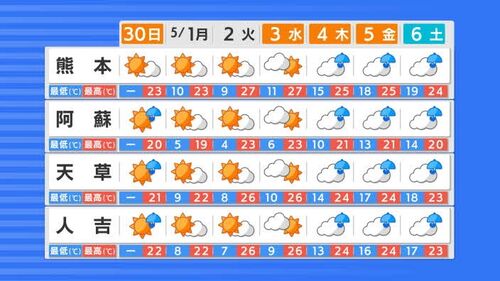 4月28日 RKK空色日記(熊本放送) · 大型連休のスタートは雨が降りそう。◆29日㊏は朝から雨に☔特に夕方~夜は前線通過で激しい雨・雷⚡に注意。風も強まり、荒れた天気となるおそれも…◆30日㊐は雲が多いものの…次第に回復へ⛅5月に入ってからは・・・「3日…