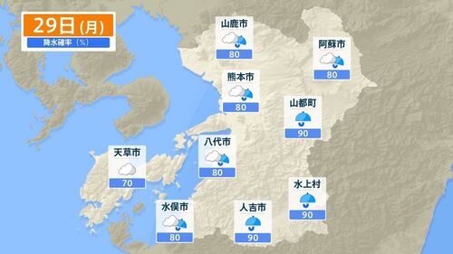 4月29日 熊本県は、低気圧や前線の影響により、曇りや雨となっています。29日は、低気圧や前線の影響により、雨で雷を伴う所があるでしょう。30日は、低気圧や前線の影響により、はじめ雨となりますが、次第に曇りとなるでしょう。阿蘇山(中岳)上空およそ1…