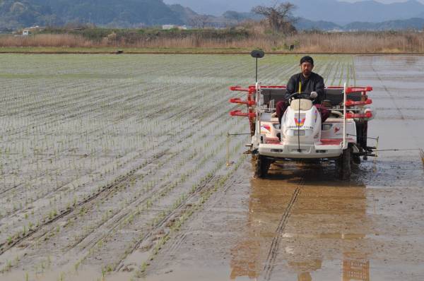 2019-03-23 天草で早期米の田植え 天草市河浦町の水田で、農事組合法人「一町田下」の組合員が約20cmに育ったコシヒカリの苗を田植え機を使って次々に植えていた。JA天草管内では約1200haで米が作られていてそのうち約9割が温暖な気候を利用して栽培する早期米。今年は種まき後に雪が降らず、暖かい日が続いたことから苗の生育が良く、去年より1週間ほど早い田植えとなった。来月上旬に早期米の田植えのピークを迎え、順調に育つと7月下旬頃には稲刈りができるという。