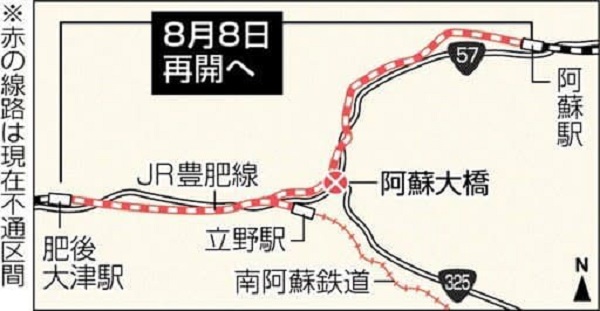 熊本地震で被災し、不通となっているJR豊肥線の肥後大津(大津町)-阿蘇(阿蘇市)間27・3キロについて、JR九州が運行再開日を8月8日とする方針を固めたことが26日、複数の関係者への取材で分かった。同社が近く発表する。