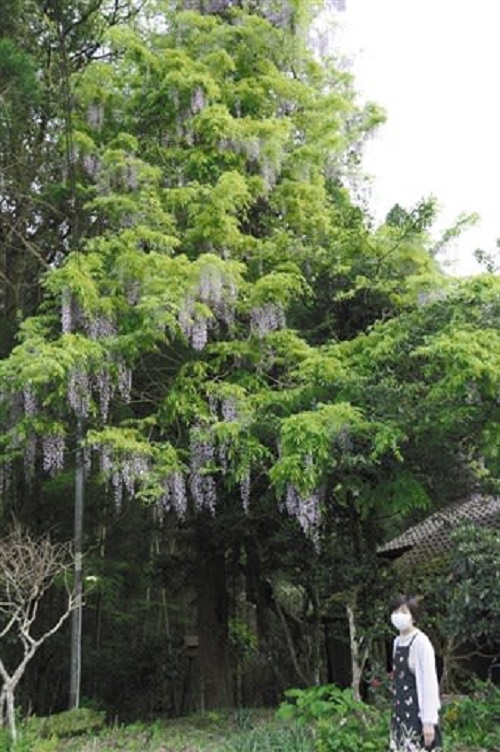 柿迫地区の一ツ氏集落では、高さ10メートルほどの樹木にフジがびっしりと巻き付いて花を咲かせ、甘い香りを漂わせていた。