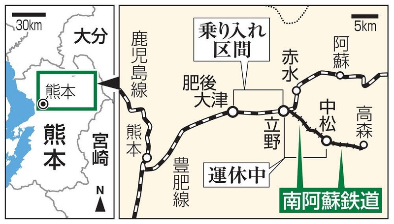 南阿蘇鉄道は橋や線路などが被災し、立野(南阿蘇村)と高森(高森町)を結ぶ路線のうち立野―中松(南阿蘇村)間の10キロ余りが運休中。
