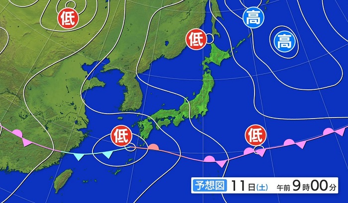 前線上の低気圧が九州の南を通過する影響であす土曜日は、まとまった雨に☔