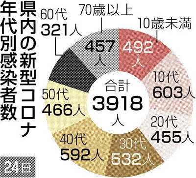 新規感染者の年代別は多い順に10代603人、40代592人、30代532人だった。(髙宗亮輔)