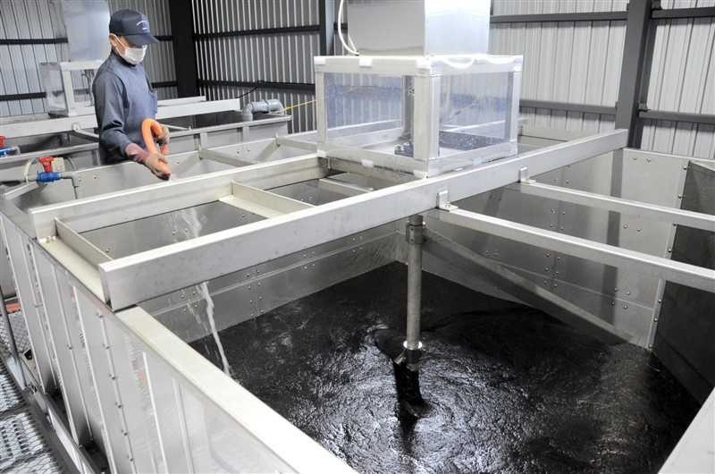 早朝に沖合で摘み取ったノリを機械で撹拌(かくはん)する橋本勝範さん。