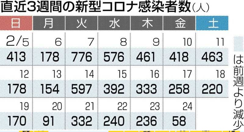 1週間前と比べて8割弱減り、38日連続で前週の同じ曜日を下回った。県内感染者の累計は53万737人となった。