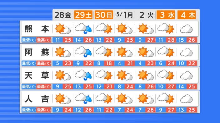 最高気温は熊本市で20度7分、菊池で19度5分、人吉で19度6分、水俣で20度0分、