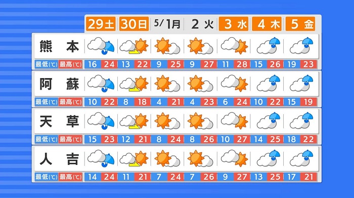 最高気温は熊本市で26度0分、菊池で25度8分、人吉で25度1分、水俣で25度6分、