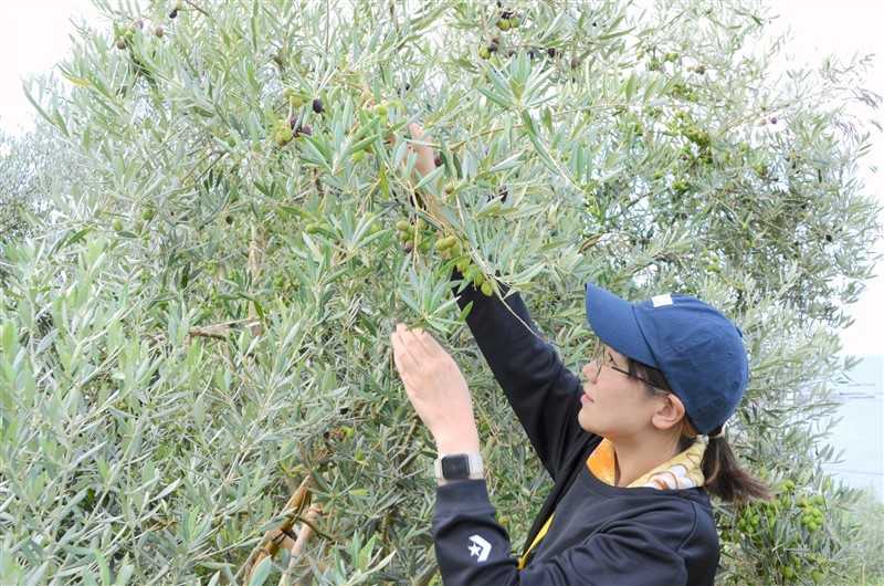 福田さん方では12種類、280本のオリーブを栽培。今年は8月の少雨の影響で実がしぼんだものの、その後は天候に恵まれ、生育は順調。収量は例年並みの400~500キロを見込む。収穫作業は10月いっぱい続き、摘み取った実はオイルや塩漬けに加工して、同町上津深江の店舗で販売する。