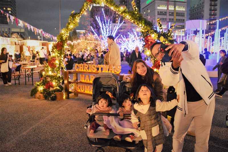 クリスマスマーケットを訪れた家族連れ=26日、熊本市西区
