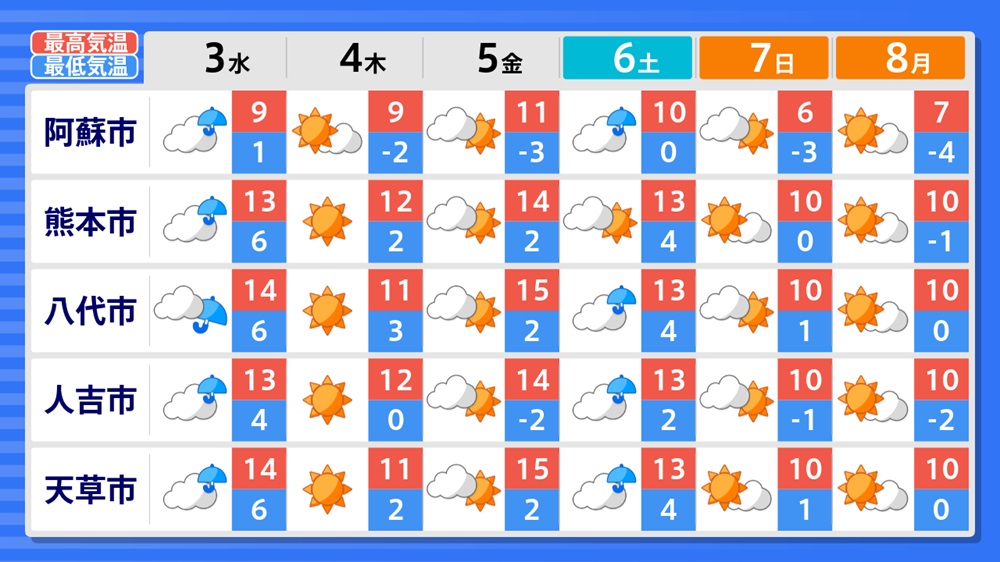 最高気温は熊本市で13度9分、菊池で12度2分、人吉で14度3分、水俣で13度5分、