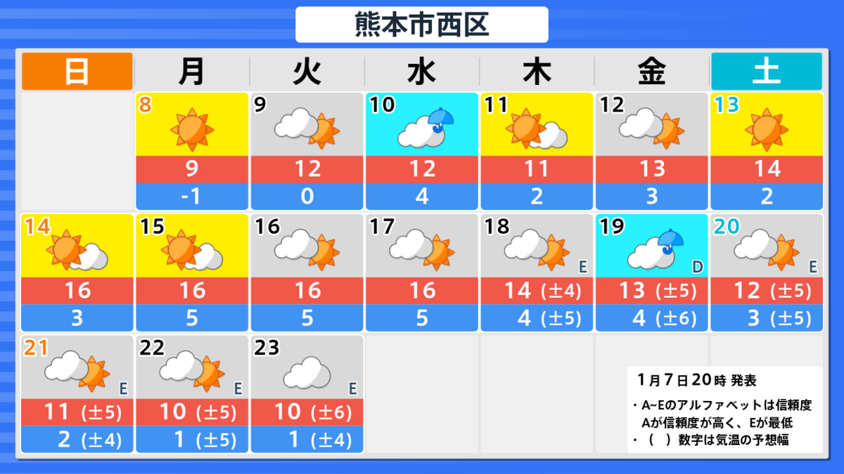 熊本市の最低気は平年より0度6分低くて、最高気温は1度0分低くなりました。
